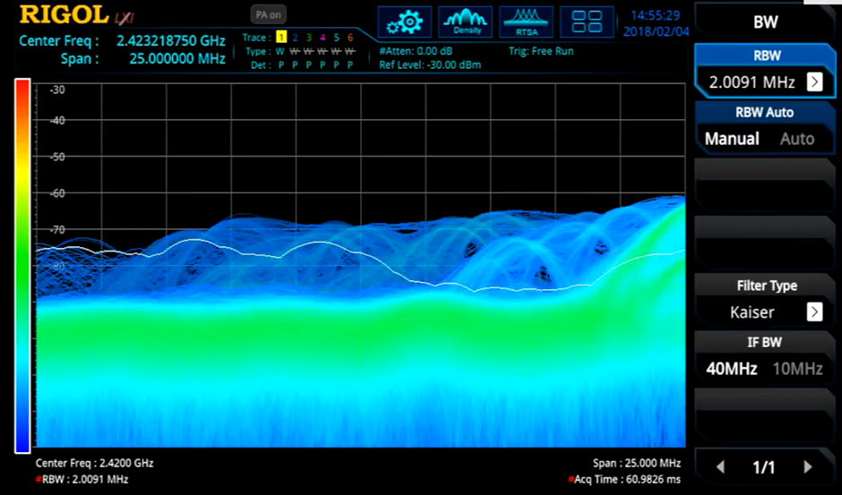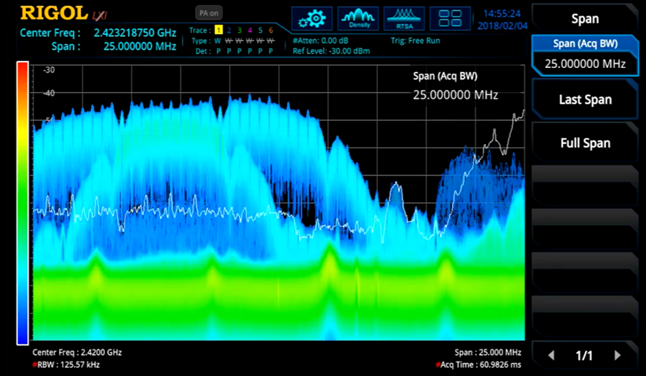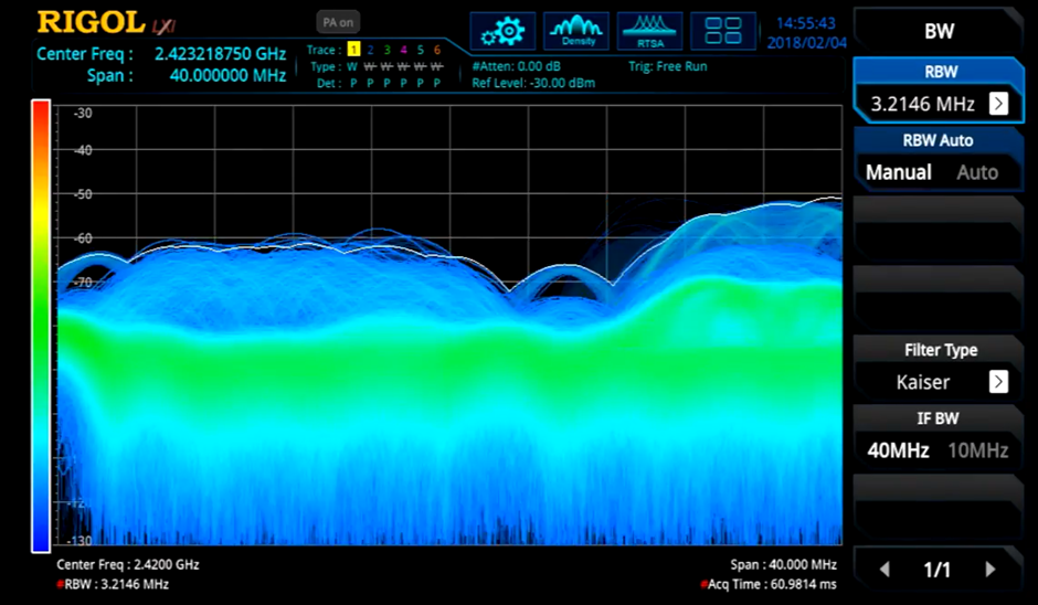 그럼 앞서 말씀드린 것과 같이, 처리량은 높지만 간섭도 있고 문제가 발생할 수 있는 가능성이 커지기 때문에 이 부분을 실시간 스펙트럼을 통해 40MHz 실시간 대역폭을 사용하여 지속되는 간섭 또는 알 수 없는 신호의 모든 인스턴스를 측정하고 싶어합니다. 따라서 RSA5000시리즈에 있는 이 40MHz Bandwidth의 옵션이 예상치 못한 신호를 쉽게 찾을 수 있도록 해주게 됩니다.
