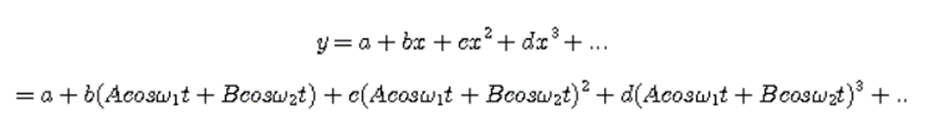Intermodulation(혼변조)는 비선형 소자를 통과하는 과정에서 두 개의 다른 입력 주파수신호의 고조파(Harmonic) 주파수들끼리 합과 차로 조합된 주파수 신호들이 나오면서 원래의 신호에 왜곡되는 현상을 IMD(Intermodulation)라고 이야기 합니다. 왜 생기는 지를 보려면, 복잡한 수식으로 들어가 보아야 하는데요. 아까 말씀드린 것 처럼 비선형소자는 Non-linearity한 성분을 가지고, 그렇기 때문에 입출력을 수식으로 계산해보면 다음과 같이 표현할 수 있습니다.
