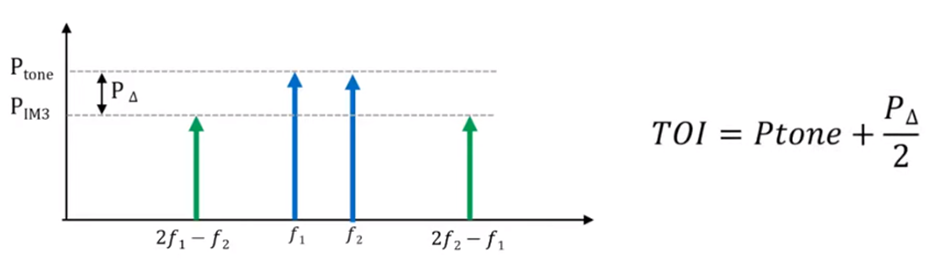 이런 3rd order IMD가 문제가 되는 이유는, 3승항이기 때문에 원신호가 1dB씩 증가할 때, 이 신호는 3승항이기 때문에 3dB씩 증가하기 때문에 그 영향이 더 클 수 있다는 거죠. 그래서 우리는 원신호인 Fundamental 신호와 Third Order 신호를 선형적으로 그려보고 만나게 되는 지점을 예상해서 그 점을 Third Order Intercept (TOI) 점이라고 표현하게 됩니다.