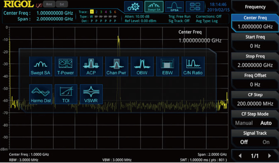 RIGOL 장비에 AMK 옵션을 사용하면 OBW를 보다 간단하게 측정할 수 있습니다. 이 OBW 측정을 통해 신호의 총 전력, 점유대역폭 및 전송 주파수 오류를 확인할 수 있습니다.