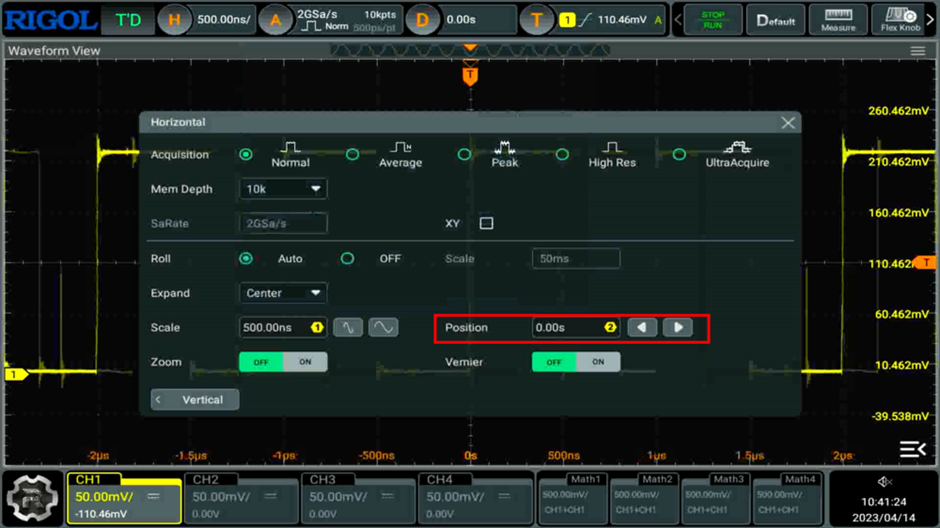 트리거 위치라고도 하는 이 수평 위치는 디스플레이의 중앙을 기준으로 수평 방향으로 모든 채널 파형의 트리거 포인트 위치를 나타냅니다. 이 때 수평 위치를 변경하게 되면 파형 트리거 포인트와 모든 채널에 표시된 파형이 수평으로 이동하게 됩니다.
