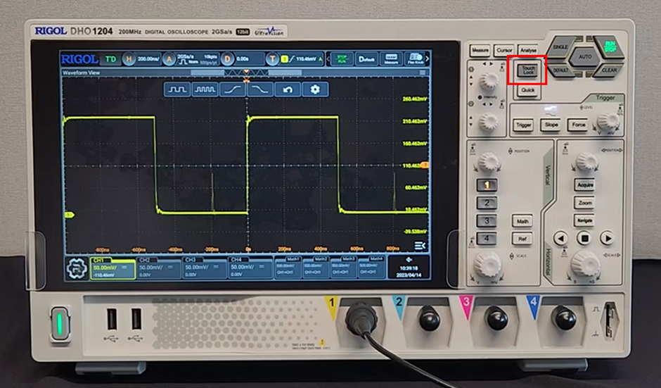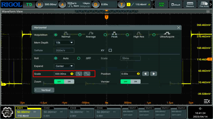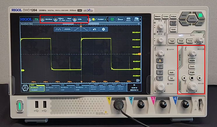 수평 스케일, 수평 시간축은 화면의 가로방향이며 일반적으로 s/div으로 표시됩니다. DHO1204에서 수평축의 범위는 2ns/div 부터 1ks/div까지의 범위로 변할 수 있습니다. 수평 시간 축을 변경하게 되면 파형은 선택한 시간을 기준으로 수평으로 확대되거나 압축됩니다.