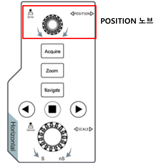 그리고 위쪽 노브는 포지션 노브입니다. 포지션 노브를 통해 지금 보고있는 파형의 위치를 관심있는 영역으로 옮겨서 가져갈 수 있습니다.
