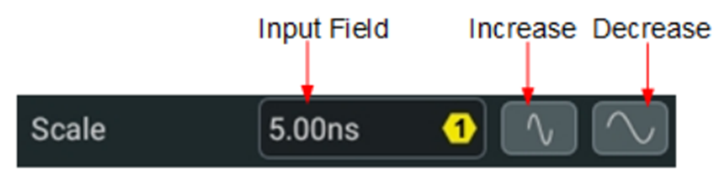 여기서 아래쪽 노브는 오실로스코프의 스윕하는 속도를 조절하는 스케일 노브입니다. 스케일 노브를 시계 반대방향으로 돌리면 신호를 받아오는 스윕 타임이 느려지고, 시계 방향으로 돌리면 스윕 속도가 빨라집니다. 더 빠른 신호를 위한 시간을 조절해서 오실로스코프를 최적화하고 관심있는 신호를 적절하게 분석하는 데에 사용할 수 있습니다.