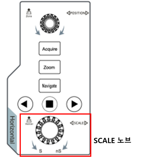 첫번째로, 프런트패널에서 SCALE 노브를 돌려 수평 시간을 조절할 수 있습니다. 시계방향으로 돌리면 눈금이 줄어들게 되고, 시계 반대방향으로 돌리면 눈금이 늘어나게 됩니다.