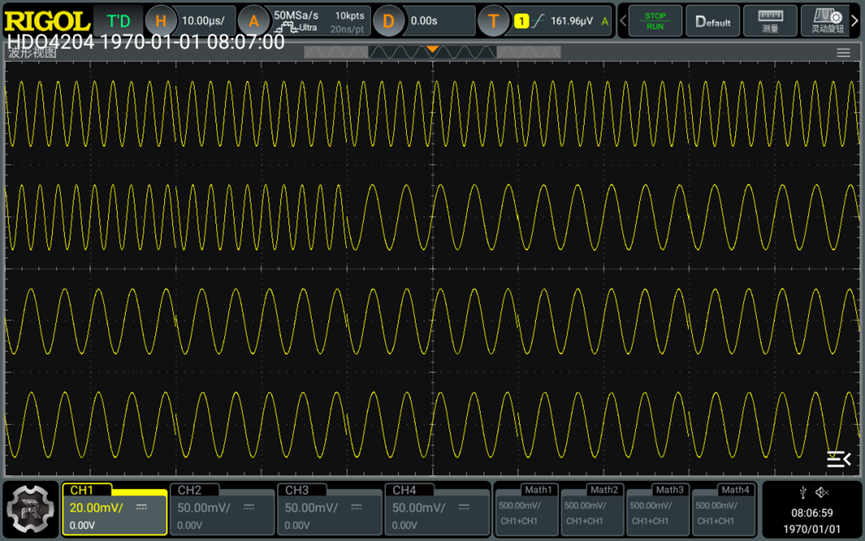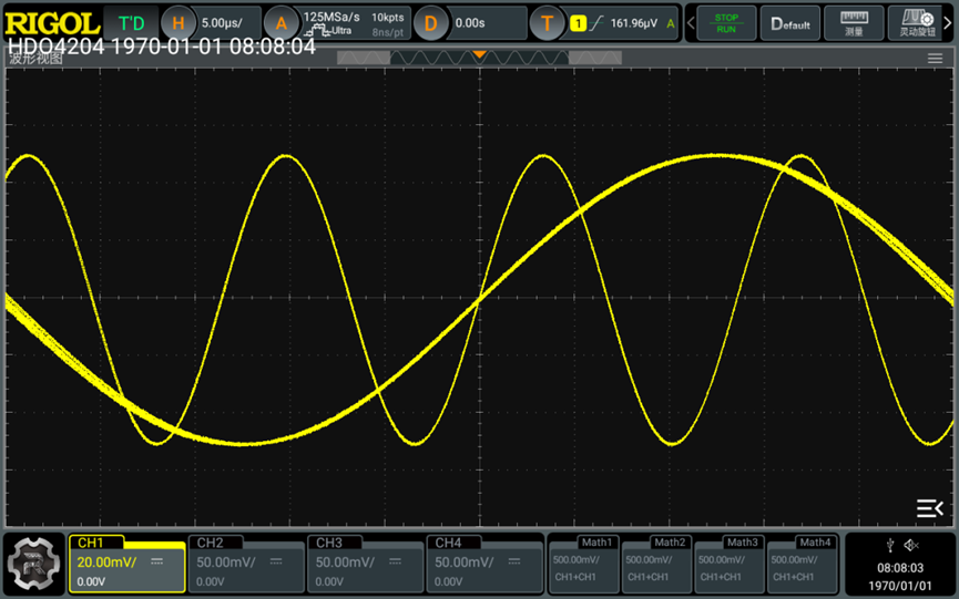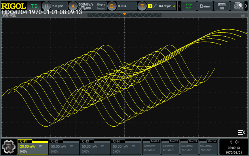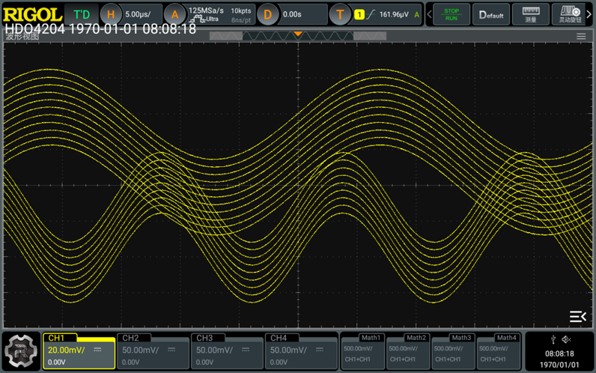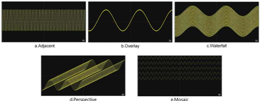 Overlay모드는 캡처된 모든 파형 세그먼트를 파형의 단일 세그먼트로 표시되도록 덮어쓰는 모드입니다. 이 모드에서는 한 번에 최대 100개의 프레임을 화면에 표시할 수 있습니다.