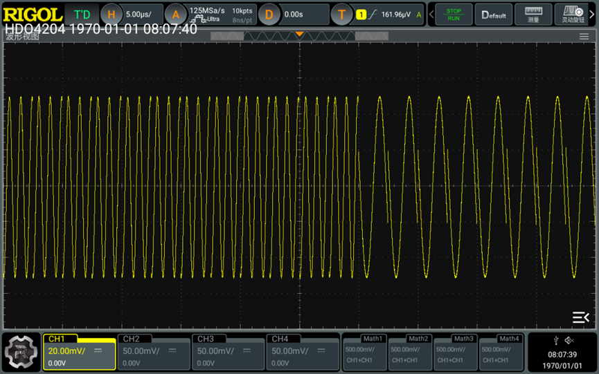 Normal 모드는 일반 획득 모드로 오실로스코프는 고정된 시간 간격으로 신호를 샘플링하여 파형을 재구성하게 됩니다. 이 모드는 대부분의 파형에 대해 최상의 디스플레이를 생성합니다.