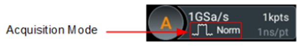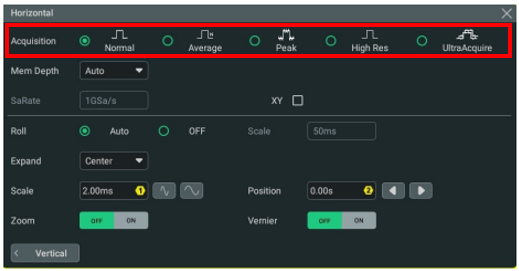 Horizontal 메뉴에서 획득 항목에 대해 원하는 획득 모드를 클릭하거나 탭 하여 변경할 수 있습니다. DHO1204에서는 Normal, Average(평균), Peak(최대 최소값), High Resolution(고해상도), Ultra Acquire (울트라 획득)이렇게 총 5가지의 수집 모드를 제공합니다. 선택한 획득 모드는 화면 상단의 레이블 A아이콘 옆에 표시됩니다.