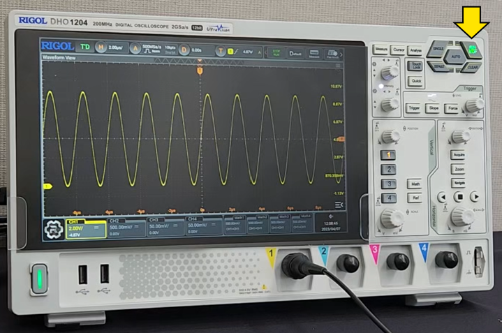 STOP/RUN 버튼을 클릭 또는 탭하거나 전면 패널 키를 눌러 샘플링을 중지할 수 있습니다. 이 때 동작 상태 라벨은 STOP으로 변경되고 빨간색으로 변경됩니다. 또한 프런트패널 키의 백라이트가 빨간색으로 바뀝니다. 오실로스코프는 마지막 캡처한 그래프를 유지합니다. 수평/수직 컨트롤을 사용하여 여전히 파형을 이동하거나 확대 축소 할 수 있습니다.