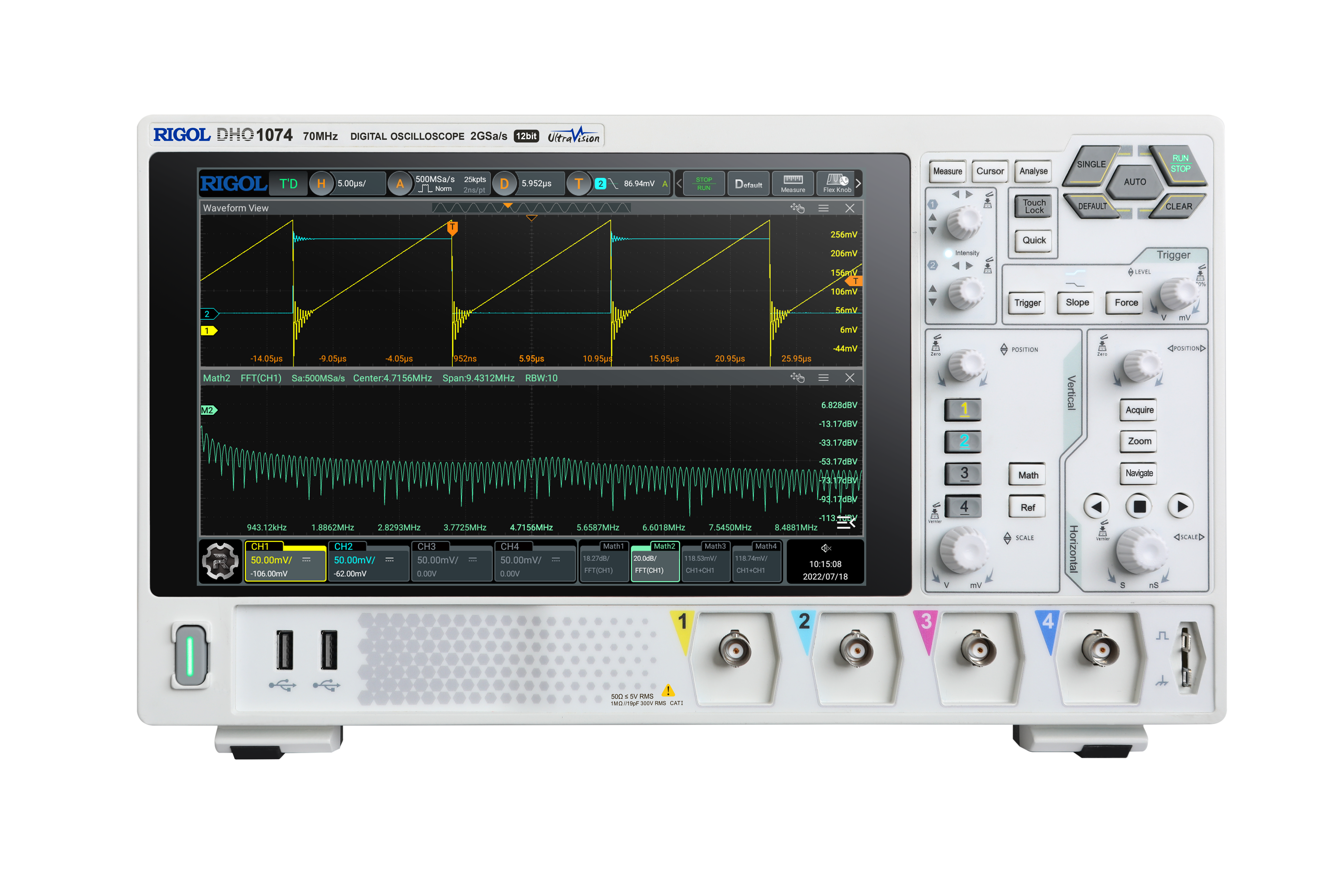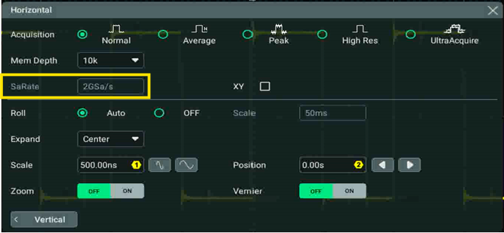아날로그 채널의 샘플 속도는 계측기 모델 및 현재 채널모드와 관련 있습니다. DHO1000 시리즈에서 2채널 모델의 경우, 단일 채널 모드에서 최대 2GSa/s 실시간 샘플링 속도를 제공하고, 모든 채널 모드에서는 1Gsa/s의 실시간 샘플링 속도를 제공합니다. DHO1000시리즈의 4채널 모델의 경우는 단일 채널 모드에서 최대 2GSa/s이며, 2채널을 사용할 경우 1Gsa/s, 4채널을 사용하는 경우 500MSa/s의 실시간 샘플링 속도를 제공합니다.